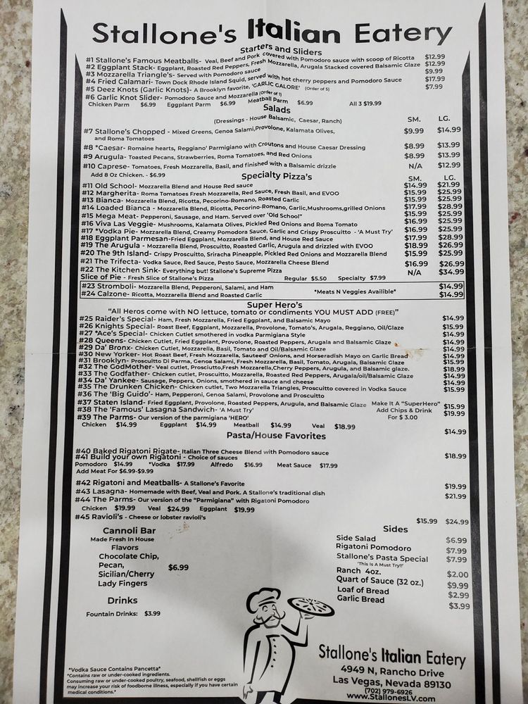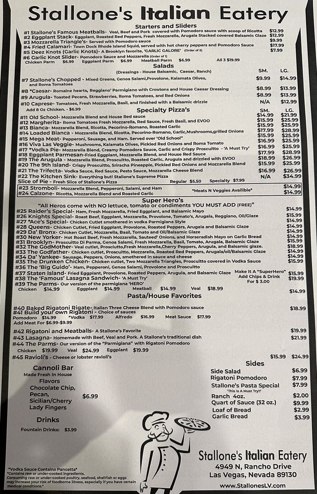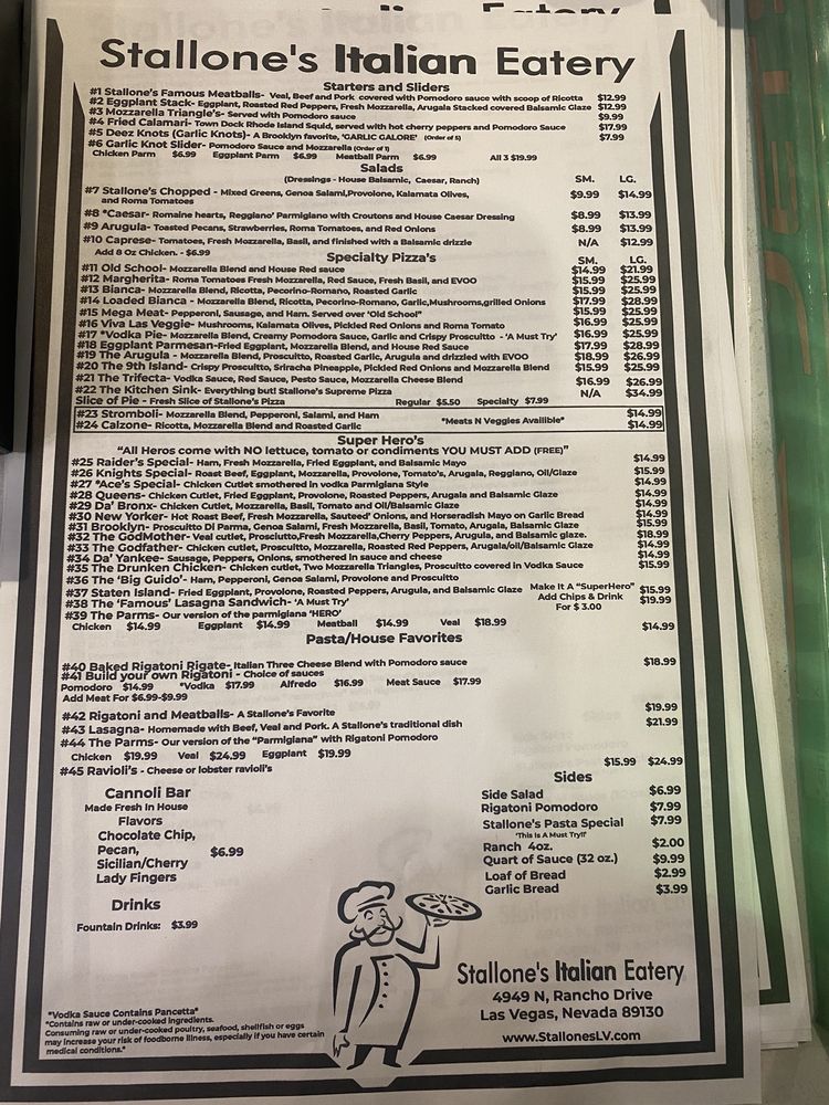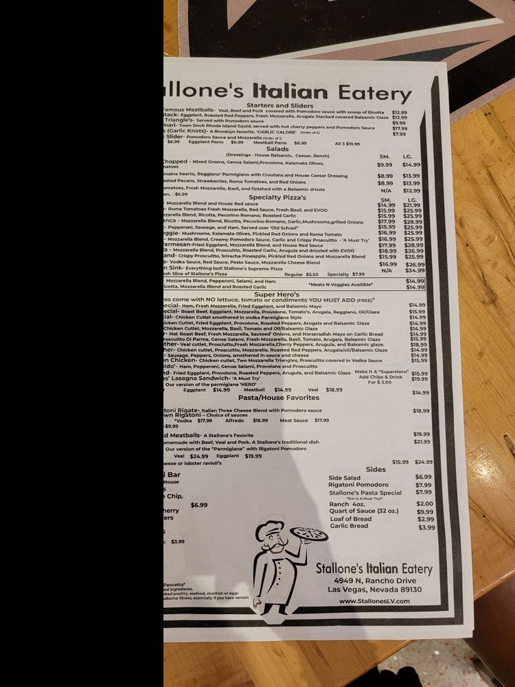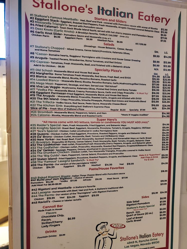 Stallone’s Italian Eatery, located at 4949 N Rancho Dr inside Santa Fe Station Hotel and Casino in Las Vegas, offers a casual dining experience with a menu featuring vegan and limited vegetarian options. The eatery provides a range of Italian dishes, such as meatballs with garlic-infused marinara sauce, flavorful calzones, loaded Bianca pizza, eggplant Parmesan, and lasagna. Customers praise the generous portion sizes and the passion for high-quality food evident in each dish. The eatery has garnered positive reviews for its fantastic Stromboli, Godfather sandwich, and Brooklyn sandwich, all made with care and attention to detail. With excellent customer service and a convenient location next to the sports book, Stallone’s Italian Eatery is a must-visit for Italian cuisine enthusiasts looking for a satisfying dining experience.